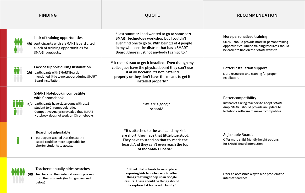 Google Classroom was identified was identified as a top competitor. Several teachers also spoke about using the Google Education suite (Google Classroom, Google Drive, Forms and Slides) extensively for teaching. From the research, we were able to arrive at some themes for comparison: